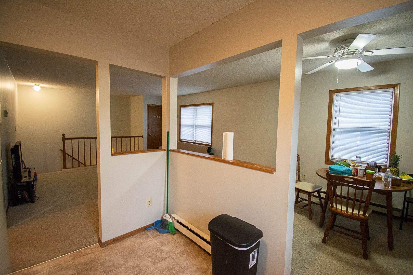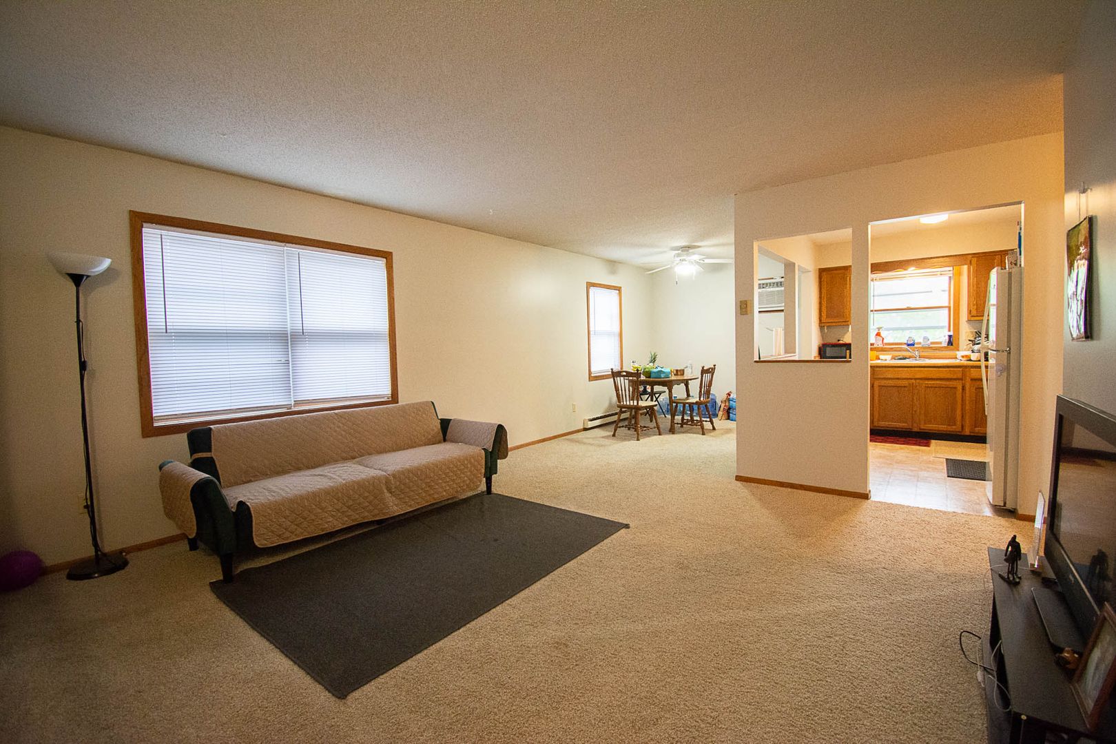 This 2-bedroom, 1-bath unit offers a simple, functional layout with an open flow between the living, dining, and kitchen areas.